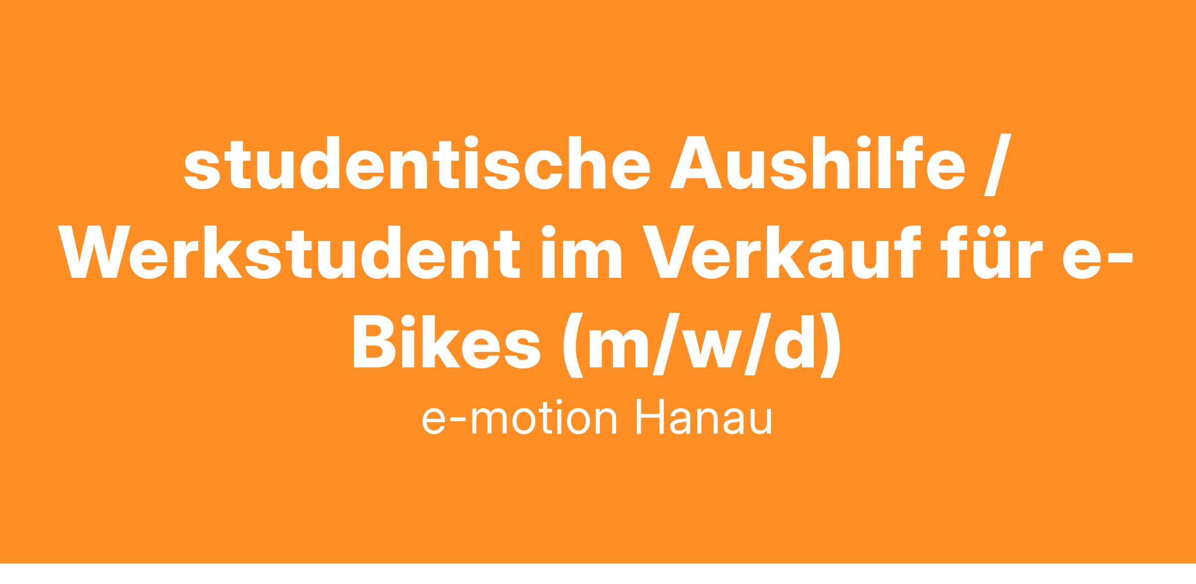 Dann schalte mit uns in den nächsten Gang und werde Teil von e-motion in Hanau bei Frankfurt. Unser Verkaufsteam sucht Dich ab sofort als Aushilfe bzw. Werkstudent im Verkauf für e-Bikes (m/w/d).
